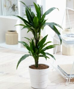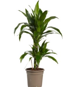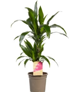 Geef snel een tropisch tintje aan je interieur met deze luchtzuiverende en makkelijk te verzorgen dracaena. De dracaena deremensis Janet Graig heeft mooie donkere bladeren die lichtjes naar beneden hangen. Deze plant heeft 2 stammen in een pot van 17cm diameter. Er zijn wel 120 verschillende soorten dracaena, waarvan sommige een bloedrode hars produceren. Daarom wordt hij ook wel drakenboom of drakenbloedboom genoemd. “Deremensis” is een synonym voor de soortnaam “Fragrans”. Deze naam heeft hij omdat er heel sterk geurende bloemen in kunnen komen. Thuis gebeurt dit trouwens bijna nooit! Een dracaena is heel makkelijk te verzorgen, doordat hij best wel even zonder water kan. Deze dracaena is ook een van de planten die de lucht in huis kan zuiveren! Dat betekent dat hij niet alleen CO2 omzet in zuurstof, maar dat hij ook allerlei schadelijke stoffen uit de lucht haalt. Perfect voor woningen in de stad en voor huizen met weinig ventilatie!