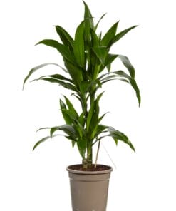 Geef snel een tropisch tintje aan je interieur met deze luchtzuiverende en makkelijk te verzorgen dracaena. De dracaena deremensis Janet Graig heeft mooie donkere bladeren die lichtjes naar beneden hangen. Deze plant heeft 2 stammen in een pot van 17cm diameter. Er zijn wel 120 verschillende soorten dracaena, waarvan sommige een bloedrode hars produceren. Daarom wordt hij ook wel drakenboom of drakenbloedboom genoemd. “Deremensis” is een synonym voor de soortnaam “Fragrans”. Deze naam heeft hij omdat er heel sterk geurende bloemen in kunnen komen. Thuis gebeurt dit trouwens bijna nooit! Een dracaena is heel makkelijk te verzorgen, doordat hij best wel even zonder water kan. Deze dracaena is ook een van de planten die de lucht in huis kan zuiveren! Dat betekent dat hij niet alleen CO2 omzet in zuurstof, maar dat hij ook allerlei schadelijke stoffen uit de lucht haalt. Perfect voor woningen in de stad en voor huizen met weinig ventilatie!