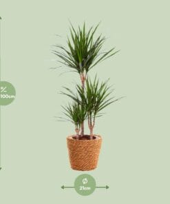 Deze Drakenboom wordt geleverd in een formaat van 21 cm, waardoor het een perfecte decoratieve toevoeging is voor elke ruimte.Met een huidige hoogte van ongeveer 95 cm, zal deze Drakenboom zeker indruk maken in uw huis of kantoor.Deze plant gedijt het beste op een plek met halfschaduw en houdt van omgevingen met matig tot weinig licht.Het verzorgen van de Drakenboom is eenvoudig, dankzij het lage onderhoudsniveau.Met zijn opvallende zwaardvormige bladeren voegt de Drakenboom een vleugje exotische schoonheid toe aan elke kamer.