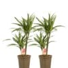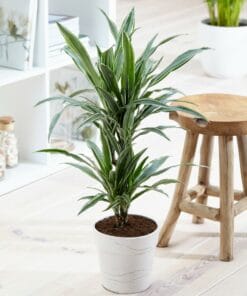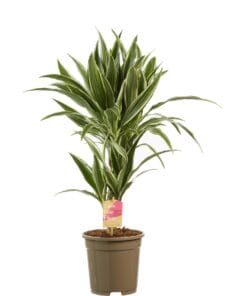 Geef snel een tropisch tintje aan je interieur met deze luchtzuiverende en makkelijk te verzorgen Dracaena. De dracaena deremensis White Stripe heeft mooie brede groene bladeren met aan de randen een witte streep. Deze plant heeft 2 stammen in een pot van 17cm diameter. Er zijn wel 120 verschillende soorten Dracaena, waarvan sommige een bloedrode hars produceren. Daarom wordt hij ook wel drakenboom of drakenbloedboom genoemd. “Deremensis” is een synonym voor de soortnaam “Fragrans”. Deze naam heeft hij omdat er heel sterk geurende bloemen in kunnen komen. Thuis gebeurt dit trouwens bijna nooit!