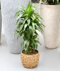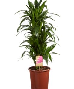 Geef snel een tropisch tintje aan je interieur met deze luchtzuiverende en makkelijk te verzorgen dracaena. De Dracaena deremensis Janet Craig heeft mooie donkere bladeren die lichtjes naar beneden hangen. Deze plant heeft meerdere stammen in een pot van 27cm diameter. Er zijn wel 120 verschillende soorten dracaena, waarvan sommige een bloedrode hars produceren. Daarom wordt hij ook wel drakenboom of drakenbloedboom genoemd. “Deremensis” is een synonym voor de soortnaam “Fragrans”. Deze naam heeft hij omdat er heel sterk geurende bloemen in kunnen komen. Thuis gebeurt dit trouwens bijna nooit! Een dracaena is heel makkelijk te verzorgen, doordat hij best wel even zonder water kan. Deze dracaena is ook een van de planten die de lucht in huis kan zuiveren! Dat betekent dat hij niet alleen CO2 omzet in zuurstof, maar dat hij ook allerlei schadelijke stoffen uit de lucht haalt. Perfect voor woningen in de stad en voor huizen met weinig ventilatie!