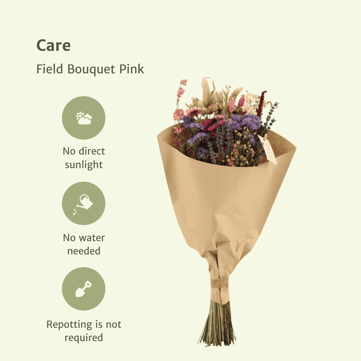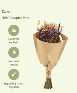 Je verzorgt droogbloemen het beste door deze uit direct zonlicht te houden. Plaats de droogbloemen het liefst op een schaduwrijke plek. Zo voorkom je dat de bloemen gaan verkleuren. Ook een hoge luchtvochtigheid is niet fijn voor droogbloemen. Vocht zorgt ervoor dat de bloemen bruin en slap worden.