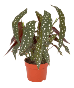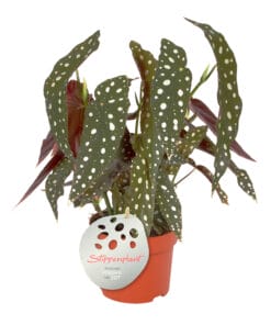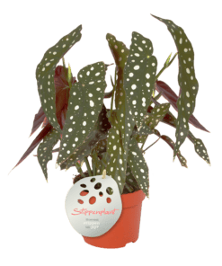 De Begonia maculata, ook wel Stippenplant of Polka Dot genoemd, is een aantrekkelijke plant. Deze mooie bladplant heeft zoals de naam al verklapt allemaal stippen op het blad. Ontelbaar veel, heb jij ze al geteld? De onderzijde van deze plant is rood/ paars, wat samen met de groene bovenkant een geweldig contract vormt. Zet de begonia op een lichte plaats maar niet in de zon, hij verdraagt beter schaduw dan volle zon. Een Begonia is een plant die bestaat in zeer veel verschillende soorten, zo zijn er meer dan 1000 gekende soorten Begonia’s. Dit maakt deze bloem dan ook een van de meest omvangrijkste geslachten uit de botanica. Ze zij ook bijzonder gevarieerd. Van oorsprong komen Begonia’s uit vochtige, warme gebieden in een bosrijke omgeving. Er bestaan zowel eenjarige als overblijvende soorten, groenblijvende en bladverliezende soorten. Er zijn zelfs klimmende varianten.