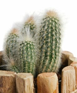 De Pseudoepostoa Melanostele is een aantrekkelijke lange, zuilvormige cactus, geleverd in een prachtige, unieke houten pot van Driftwood. Op de groene stam zitten stevige witte stekels. Zoals je op de foto ziet groeit deze cactus vaak uit meerdere stammen, of hij vertakt zichzelf. De grijze beharing bovenop geeft de cactus een uniek uiterlijk. De dichtheid van de stekels neemt toe als de cactus ouder wordt.