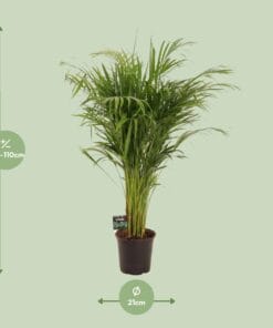 Deze Bamboepalm wordt geleverd in een pot van 21 cm.De huidige hoogte van deze Bamboepalm is ongeveer 110 cm.Deze plant gedijt goed op een plek met halfschaduw.Het verzorgen van een Bamboepalm is ontzettend eenvoudig.Zijn aantrekkelijke verschijning voegt een vleugje elegantie toe aan elke ruimte.