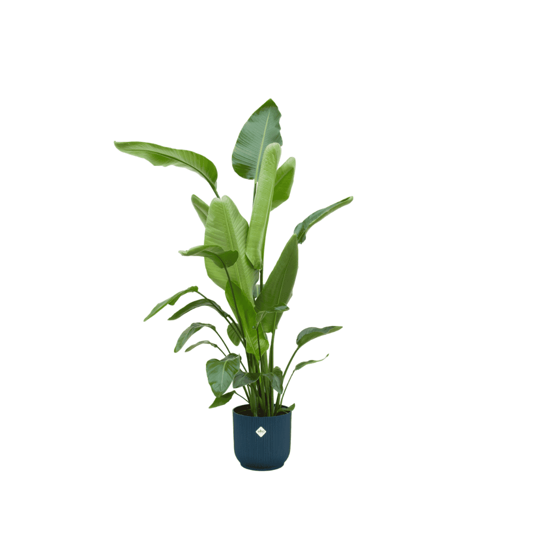 De Strelitzia Nicolai, ook wel bekend als de witte paradijsvogelbloem, is een indrukwekkende en majestueuze plant die een vleugje tropische pracht toevoegt aan elk interieur. Met zijn opvallende, grote bladeren en weelderige groeiwijze creëert deze plant direct een gevoel van weelderige sereniteit en exotische allure. De elho Vibes Fold Round pot vormt een perfecte aanvulling op de Strelitzia Nicolai, met zijn moderne, minimalistische design en duurzame kwaliteit. Samen vormen ze een prachtig accentstuk dat elke ruimte verfraait met een vleugje natuurlijke elegantie en eigentijdse stijl.