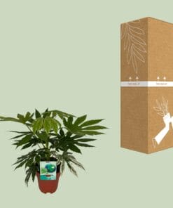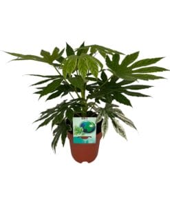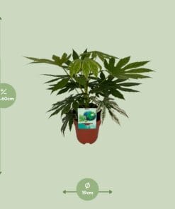Maak kennis met Fatsia japonica “Spiderweb”, een prachtige kamerplant die een elegante touch geeft aan elke ruimte. Ook bekend als de Ricinusolieplant, heeft deze schoonheid haar oorsprong in het majestueuze land Japan. Met haar betoverende bonte bladeren, met spetters van crèmewit, voegt ze moeiteloos een vleugje kleur toe aan je interieur. Deze plant gedijt niet alleen moeiteloos binnenshuis, maar zal je zeker fascineren met haar weelderige groene uiterlijk en lage onderhoudseisen. Verhoog je binnen-oase met Fatsia japonica “Spiderweb”, de perfecte toevoeging aan je botanische collectie! Maak kennis met onze verbluffende Fatsia japonica “Spiderweb”, de perfecte aanvulling voor binnen- of buitenruimtes! Deze unieke plant gedijt het beste op een plek met gedeeltelijke schaduw, waardoor het ideaal is voor elke goed verlichte plek. Met zijn prachtige bontgekleurde bladeren zal deze altijdgroene schoonheid zeker indruk maken op uw gasten. Voor optimale groei en gezondheid, geef uw Fatsia japonica “Spiderweb” eens per week water, zorg er daarbij voor dat de grond vochtig blijft maar nooit doorweekt. Met zijn makkelijke verzorging en opvallende verschijning is deze plant een must-have voor elke plantenliefhebber. Koop nu en verrijk uw ruimte met deze prachtige Fatsia japonica “Spiderweb”!Fatsia japonica, ook bekend als “Japanse Aralia”, is een opvallende sierplant die populair is vanwege zijn weelderige, bontgekleurde bladeren. Met zijn levendige tinten crèmewit en donkergroen voegt deze plant een vleugje elegantie toe aan elke binnen- of buitenruimte. Echter, ondanks zijn aantrekkelijke uiterlijk, is het belangrijk op te merken dat Fatsia japonica alleen bedoeld is als decoratie. Helaas is dit betoverende blad niet geschikt voor consumptie. Laten we dus genieten van zijn schoonheid, terwijl we erkennen dat het puur om visuele betovering gaat en niet om culinair genot!- Fatsia japonica “Spiderweb” heeft een potmaat van 19 cm en bereikt een hoogte van ongeveer 60 cm.- Ook bekend als de Ricinus communis plant, is Fatsia japonica “Spiderweb” een populaire sierplant.- Deze plant gedijt goed in Halfschaduw, wat een plek is met gedeeltelijke schaduw.- Fatsia japonica “Spiderweb” wordt gewaardeerd om zijn bontgebladerte, met prachtige crèmewitte randen die afsteken tegen de donkergroene bladeren.- Leuk feit: In Japan wordt Fatsia japonica “Spiderweb” beschouwd als een symbool van geluk en voorspoed, en daarom komt het vaak voor in tuinen en huizen.