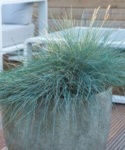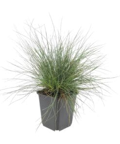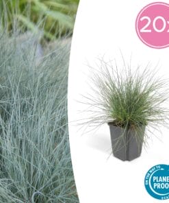 **Festuca glauca ‘Eljae Blue’** is een prachtige, blauwgrijze grassoort die het hele jaar door kleur toevoegt aan uw tuin. Deze onderhoudsvriendelijke plant bloeit in mei en juni met elegante witte pluimpjes. Hij gedijt in de volle zon en op droge, doorlatende grond. Snoei hem in het vroege voorjaar voor optimale groei en deel elke 2-3 jaar om zijn schoonheid te behouden. Perfect voor rotstuinen en borders! Voeg deze eye-catcher toe aan uw tuin en geniet van zijn unieke uitstraling!