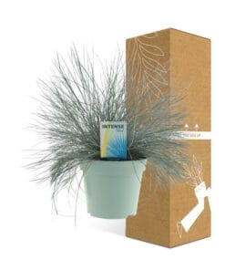 Stel de Festuca Glauca Intense Blue voor, ook wel bekend als Blauw Schapengras. Dit prachtige buitenplantje heeft intense blauwe bladeren. Deze onderhoudsarme en robuuste grassoort komt oorspronkelijk uit de rotsachtige bergen van Europa en voegt natuurlijke charme toe aan elke tuin of landschap. Met zijn compacte groei en unieke kleur zorgt Festuca Glauca Intense Blue voor een verbluffend visueel contrast en textuur. Deze veelzijdige plant is bestand tegen droogte en gedijt in volle zon, waardoor hij perfect is voor borders, rotstuinen en bloembakken. Voeg een vleugje intens blauw toe aan je buitenruimte met Festuca Glauca Intense Blue, de ultieme keuze voor elke tuinliefhebber. Festuca, algemeen bekend als Blauw schapengras, gedijt goed op zonnige locaties en heeft weinig water nodig. Het groeit het beste in goed doorlatende grond met een zanderige of leemachtige textuur. Voor optimale groei wordt aanbevolen om Blauw schapengras een- of tweemaal per jaar te bemesten, in het voorjaar en de herfst, met een gebalanceerde langzaam vrijkomende meststof. Overbemesting kan leiden tot overmatige groei en verminderde ornamentale waarde, dus is het belangrijk om de aanbevolen dosering te volgen. Regelmatig verwijderen van dode of verwelkte bladeren helpt bij het behouden van de algehele gezondheid en uitstraling van de plant.Leuke feit: Festuca Glauca Intense Blue, met zijn levendige blauwgroene bladeren, creëert een opvallende visuele aantrekkingskracht in tuinen en landschappen. Dit siergras is een onderhoudsarme en droogtetolerante optie, waardoor het perfect is voor drukke tuiniers. Het is echter belangrijk op te merken dat hoewel Festuca Glauca Intense Blue schoonheid toevoegt aan uw omgeving, het puur een decoratieve plant is en niet gegeten moet worden voor culinaire doeleinden. Dus, hoewel het je oog kan vangen, is het het beste om vanaf een afstand van dit heerlijke gras te genieten.- Festuca Glauca Intense Blue is een populaire siergrasplant die verkrijgbaar is in een pot van 17 cm grootte.- Deze variant van Festuca Glauca Intense Blue groeit doorgaans tot ongeveer 40 cm hoog.- Festuca Glauca Intense Blue wordt ook vaak Blauw Schapengras genoemd.- Deze plant gedijt goed in de volle zon en is daarom een perfecte keuze voor tuinen met een zonnige plek.- Leuk feitje: Festuca Glauca Intense Blue staat bekend om zijn opvallende zilverblauwe bladeren, die een levendige kleurtoon toevoegen aan elk landschap.