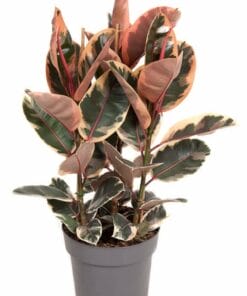 De Ficus ‘Belize’ is een volle plant met groot glanzend blad, ovaal van vorm. Het blad heeft een duidelijke nerf en heeft de kleurtinten roze, crème en groen.