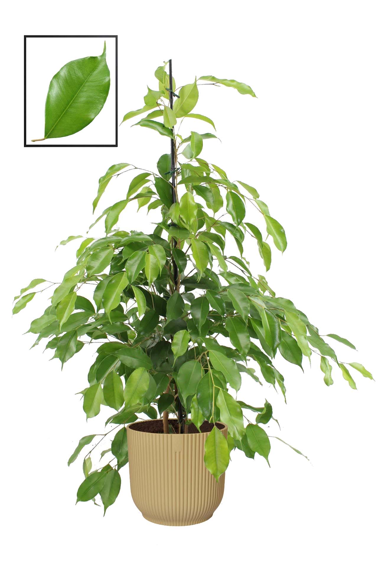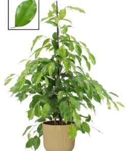 De Ficus benjamina is een van de bekendste soorten uit de Ficus- familie. Met zijn kleine gladde blaadjes en hangende takken is deze kamerplant, die ook wel Treurvijg genoemd wordt, een sieraad in ieder interieur. De ‘Exotica’ heeft licht blad en is mooi compact.