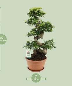 Deze Ficus wordt geleverd in een perfect formaat pot van 27 cm, klaar om tentoongesteld te worden in uw huis of kantoor.Met een geschatte hoogte van 70 cm, is deze Ficus klaar om natuurlijke schoonheid en elegantie te brengen in elke ruimte.Vind de ideale plek voor deze Ficus in uw huis of kantoor – hij gedijt in halfschaduw en is daardoor een veelzijdige en aanpasbare plant.Het verzorgen van deze Ficus is eenvoudig – het is een makkelijk te onderhouden plant die slechts minimale aandacht nodig heeft om te groeien en te gedijen.Met weelderige groene bladeren en een gracieuze uitstraling, zal deze Ficus een vleugje natuurlijke charme toevoegen aan uw interieurontwerp.