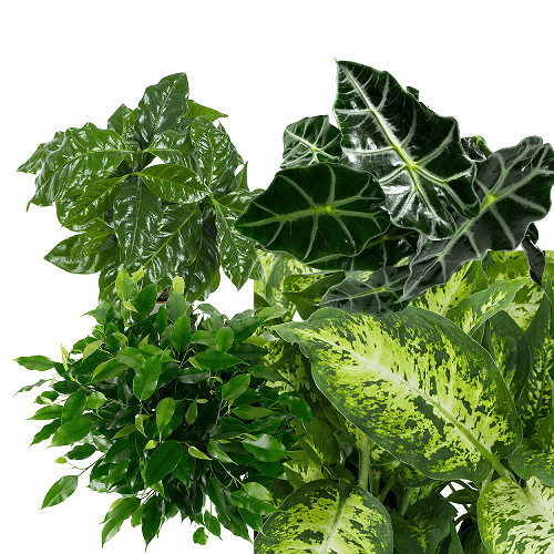 “Groen, rijk aan bladeren, niet voor niets is Ficus al jaren een van de populairste groene kamerplanten. De ‘Green Kinky’ staat op een korte stam. “”‘Bergkoffie’ uit Ethiopië was de eerste koffieplant die door de mens werd geteeld. In het wild groeit hij onstuimig.Zet hem naast uw koffieapparaat, bij het keukenraam. Als de plant het goed doet, dan krijgt u na een jaar of vier mooie witte bloemen. Dat worden na bevruchting de bonen. Alocasia (Skeletplant) behoort tot de Aronskelkfamilie en is een frisgroene tropische plant. ‘Skelet’ verwijst naar de bijna witte nerven die erg opvallen op de donkere bladeren. “”Het blad van de Dieffenbachia compacta is vreemder gekleurd dan dat van de ‘gewone’. Vandaar de naam ‘Exotica’. Deze plant is van oorsprong tropisch. Let op met jonge kinderen, katten en konijnen: een hap dieffenbachiablad is minstens pijnlijk, maar kan zelfs tot tijdelijke verlamming leiden. Hoewel giftig zorgt de plant wél voor zuivering van de lucht in je huis.