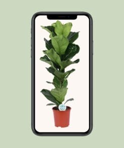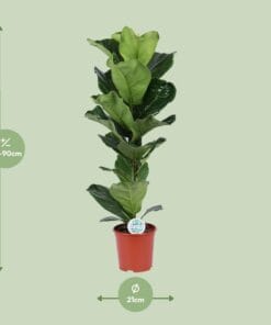 Op zoek naar een prachtige kamerplant om jouw leefruimte naar een hoger niveau te tillen? Zoek niet verder dan de Ficus lyrata, ook wel bekend als de Ficus plant. Deze trendy en exotische schoonheid komt oorspronkelijk uit West-Afrika en heeft grote, glanzende groene bladeren die lijken op de vorm van een viool, vandaar de bijnaam “Fiddle-leaf Fig”. Niet alleen voegt het een vleugje elegantie toe aan elke kamer, maar Ficus lyrata wordt ook geprezen om zijn luchtzuiverende eigenschappen. Haal de natuur naar binnen met deze SEO-geoptimaliseerde kamerplant die zeker de aandacht zal trekken en de kwaliteit van jouw binnenlucht zal verbeteren. Om voor de Ficus te zorgen, moet je een plek in halfschaduw vinden omdat direct zonlicht de bladeren kan beschadigen. Eenmaal per week water geven is voldoende, waarbij je ervoor zorgt dat de bovenste centimeter van de grond droog is voordat je opnieuw water geeft. Plant de Ficus in goed doorlatende grond, zoals een mengsel van potgrond en perliet. Bemest de plant elke 4-6 weken tijdens het groeiseizoen en verdun de meststof tot halve sterkte om overbemesting te voorkomen. Vergeet niet om af en toe de bladeren af te vegen om stofophoping te voorkomen en de gezonde groei te bevorderen.Wist je dat Ficus lyrata, ook bekend als de vioolbladboom, een populaire keuze is geworden voor liefhebbers van kamerplanten? Met zijn grote, glanzende bladeren die op een viool lijken, voegt het een vleugje elegantie toe aan elke kamer. Maar hier is een vriendelijke herinnering: hoewel het verleidelijk kan lijken, is deze plant strikt voor decoratieve doeleinden bedoeld. Dus weersta de drang om er een hapje van te nemen, want het is niet bedoeld om te worden gegeten. In plaats daarvan, leun achterover, ontspan en geniet van de schoonheid en charme die deze mooie plant aan je ruimte brengt!- Ficus lyrata heeft een potmaat van 21 cm, waardoor het geschikt is voor kleine tot middelgrote ruimtes.- Deze plant groeit meestal tot een hoogte van ongeveer 90 cm, waardoor het een uitstekende keuze is voor binnen- of buitentuinen.- Ficus lyrata staat ook bekend als de vioolbladplant vanwege zijn grote, vioolvormige bladeren.- Deze plant gedijt goed op een plek met halfschaduw, wat het veelzijdig maakt voor verschillende lichtomstandigheden.- Leuk weetje: De bladeren van de Ficus lyrata kunnen tot 30 cm lang groeien en hebben een unieke, gerimpelde textuur, wat een interessant element toevoegt aan elke ruimte.