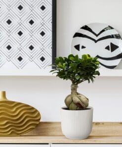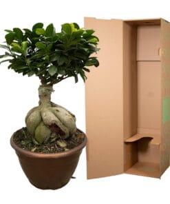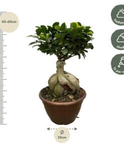 - Uiterlijk van de plant: De Ficus Microcarpa Ginseng heeft een robuuste, gedraaide wortelstructuur die bijna op een miniatuur-boomstam lijkt. De bladeren zijn glanzend, ovaal en diepgroen, en creëren een mooie, compacte kroon die de plant een elegante uitstraling geeft.