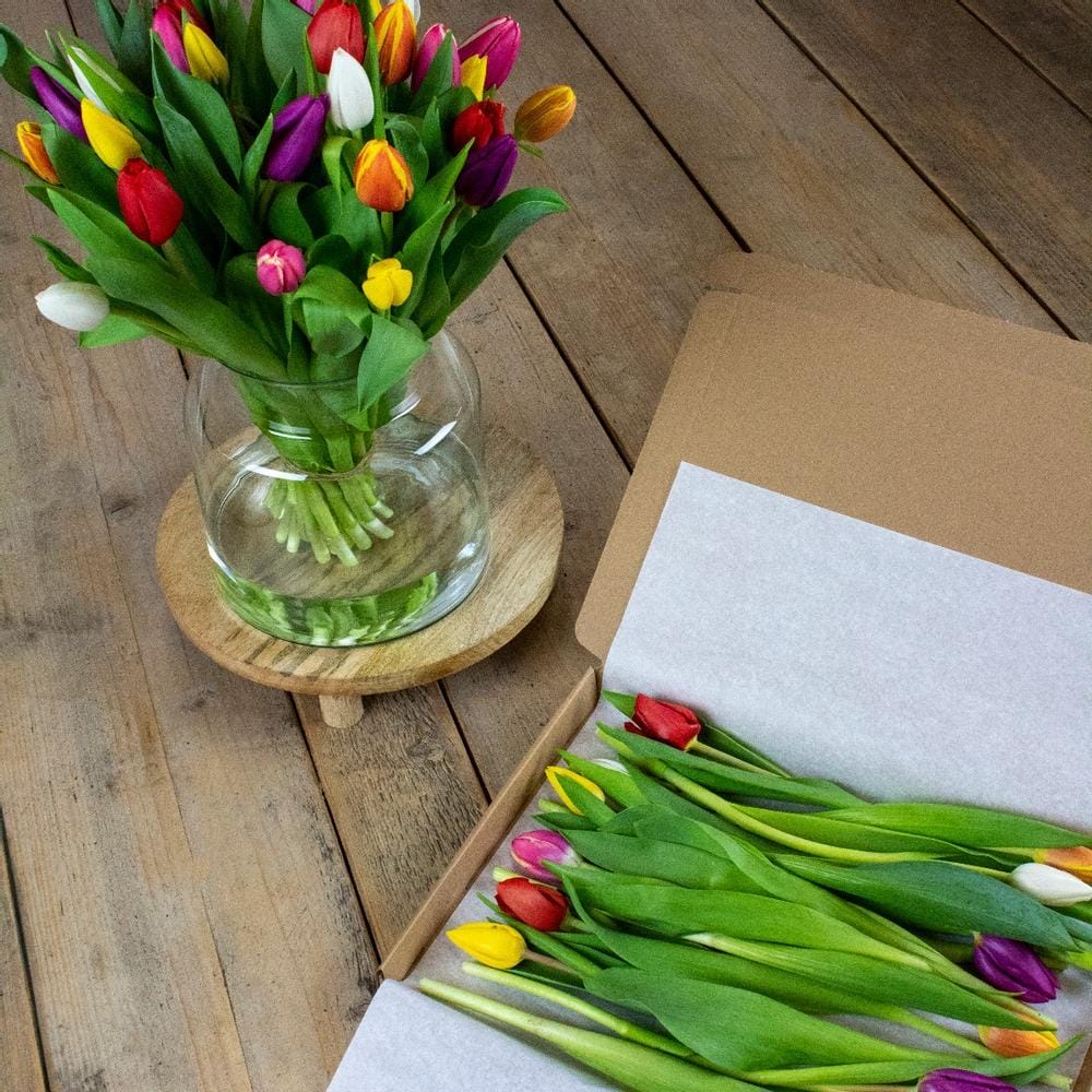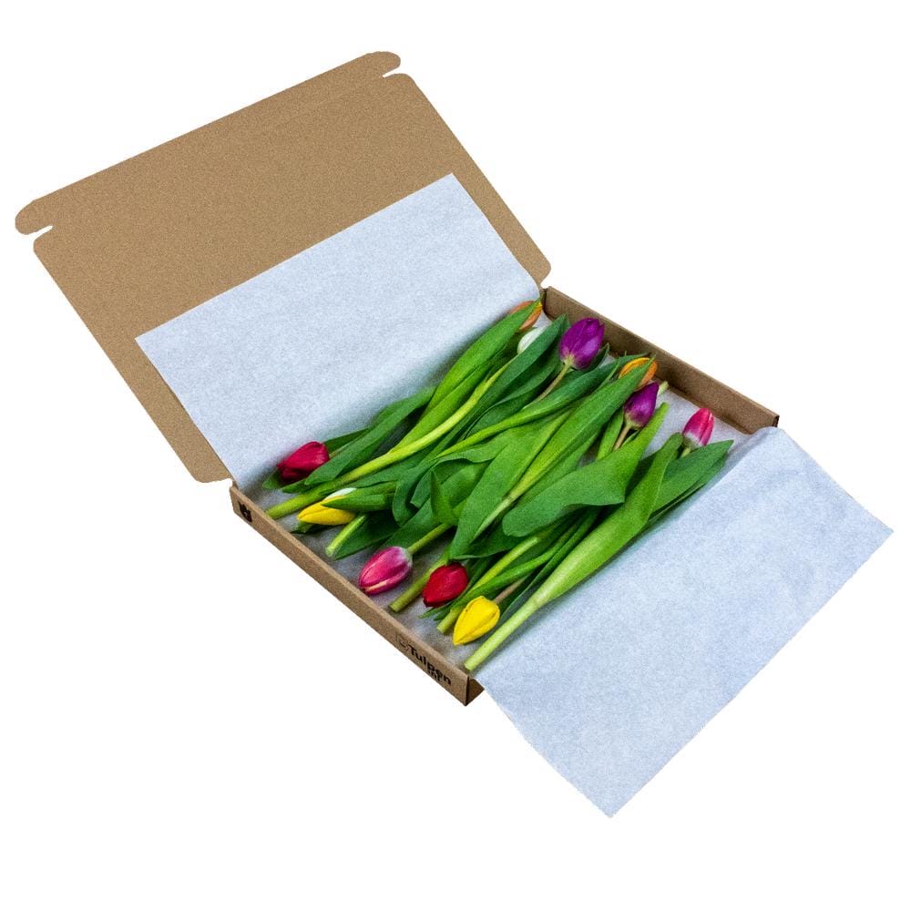 Het brievenbusdoosje bevat 10 gemengde tulpen.