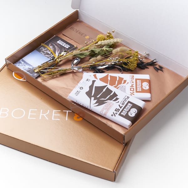 Een combinatie van duurzame mini droogbloemen van de hoogste kwaliteit, direct van de bron uit Aalsmeer en duurzaam geproduceerde “echte chocola” met een smaakbeleving zoals je nog nooit eerder hebt geproefd, van puur Hollandse Chocolate Makers uit Amsterdam.