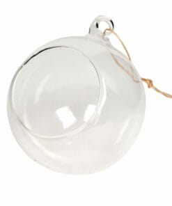 Je luchtplantjes creatief ophangen? Geef je luchtplantjes een vrij gevoel met dit leuke ronde glas! Het glas heeft een lus bovenop, waarmee hij kan worden opgehangen. Leuk om een set van 2 of 3 bij elkaar te hangen op verschillende hoogtes met bijvoorbeeld wat fijn grind onderin. Het product heeft een diameter van 10 centimeter en een platte onderkant en kan daarom ook worden neergezet op tafel of een dressoir.