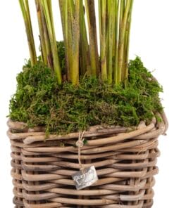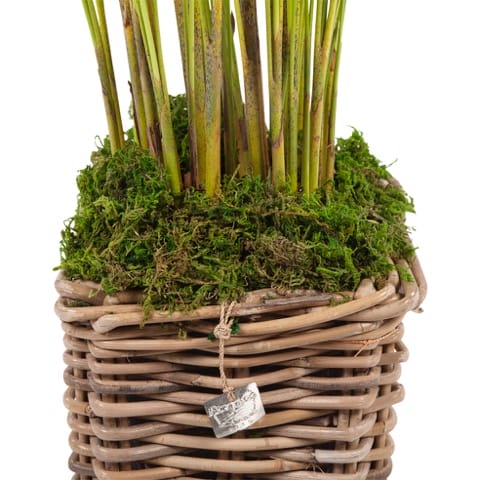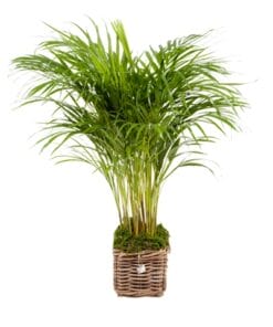 Deze struik Goudpalm staat in een mooie rieten mand (met binnenpot). De grond is afgedekt met mos. De goudpalm komt uit Madagaskar. Daar een bedreigde soort, maar onder andere op de Caraïben zijn ze verwilderd en veel voorkomend. In de volle zon verkleuren de bladeren en de plant heeft gele bloemetjes: vandaar Goudpalm. De Areca is niet makkelijk, maar wel populair in interieurs. Onder gunstige omstandigheden groeit hij tot aan het plafond. In de natuur kan hij 10 meter hoog worden.