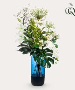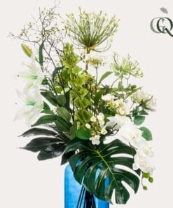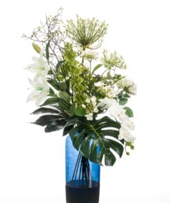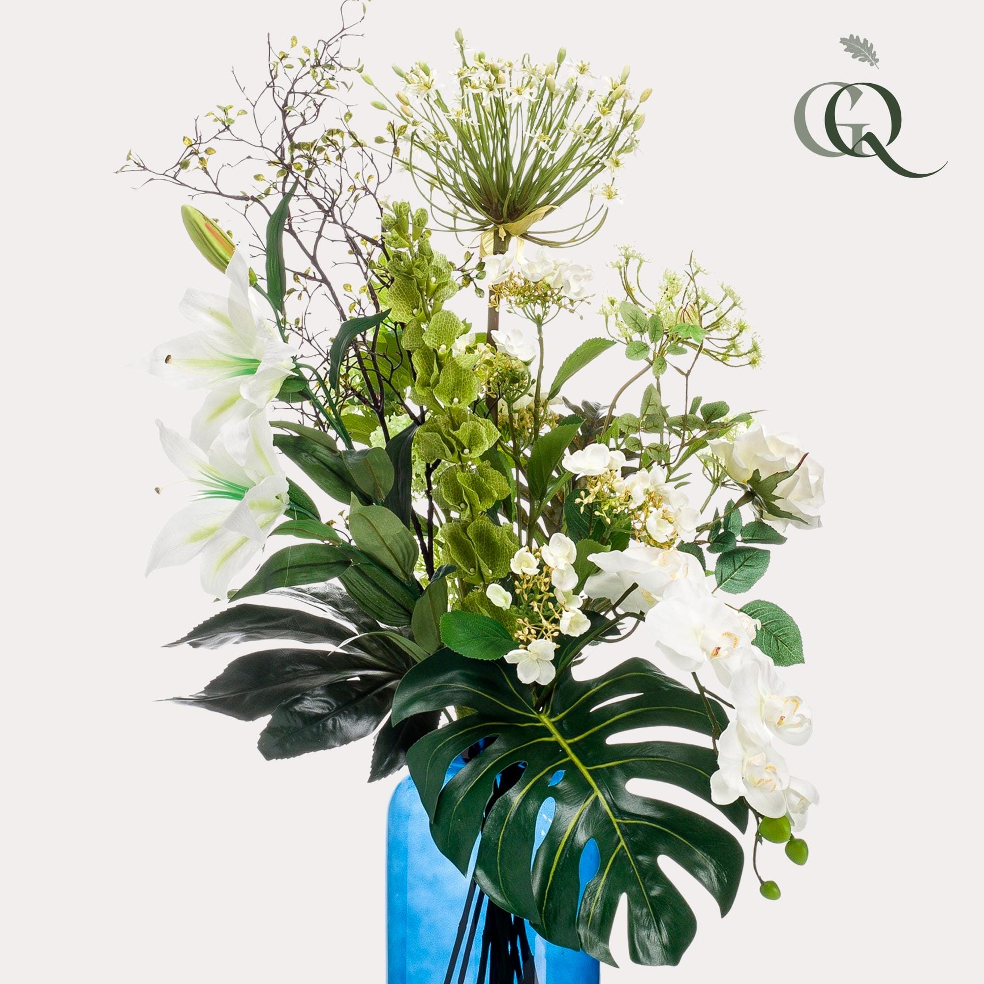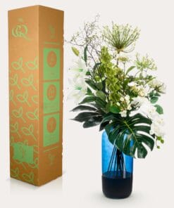 Voeg een vleugje verfijning toe aan je interieur met dit prachtige kunstboeket. Elk detail is met liefde samengesteld door onze deskundige bloemisten, die streven naar perfectie. Deze hoogwaardige kunstbloemen behouden hun schoonheid en frisheid zonder enige vorm van onderhoud. Creëer een sfeer van tijdloze elegantie op je eettafel, dressoir, vensterbank, kaptafel of bureau met dit onderhoudsvrije boeket. Laat je betoveren door de realistische uitstraling en geniet van de blijvende schoonheid van kunstbloemen in je interieur.