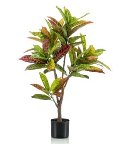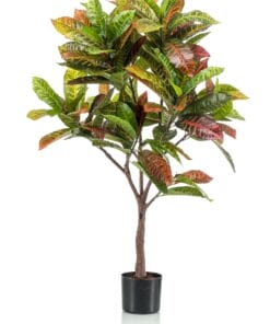 De Croton Codiaeum komt oorspronkelijk uit Zuid-Oost Azië en heeft veel water en zonlicht nodig. Onze mooie kunst Croton gedijt echter op elk plekje in huis of kantoor.De Nederlandse naam Wonderstruik heeft hij gekregen omdat er in het wild ook exemplaren zijn met allerlei wonderlijke kleuren. Onze kleine kunst Wonderstruik houdt het bij de kleur groen. Neem jij deze mooie groene kunstplant in huis? De Croton Codiaeum is ook verkrijgbaar als boom in 95 en 120 cm.