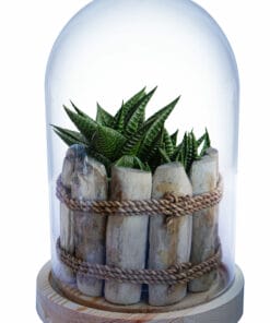 Prachtige, intens groene vetplant. In de natuur komt de Haworthia Limafolia voor in Zuid-Afrika. Hier groeit de vetplant in zanderige grond en vaak in de schaduw. De bladeren groeien langwerpig en in een driekhoekige vorm. De Haworthia Limafolia groeit met een draai, dit maakt de plant erg uniek en een mooie aanvulling op het interieur. Aan het einde van de zomer en in de herfst bloeit deze vetplant. Vanuit het hart van de plant groeit een dunne stengel met daaraan veel witgroene bloemen. De plant is verkrijgbaar in een unieke houten pot van Driftwood. Dit is een natuurproduct. Elke pot is daardoor uniek. De plant wordt daarbij geleverd in een unieke glazen stolp met LED verlichting (inclusief batterij).