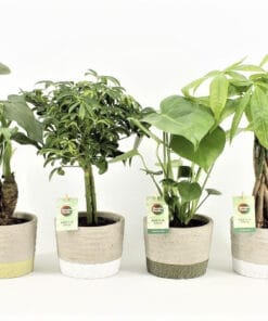 De Alocasia Cucullata wordt gekenmerkt door mooie pijlvormige groene bladeren en een opvallend compacte groei. De Pachira (die ook wel watercacao of geldboom genoemd wordt) is een mooie palm, met een gevlochten stam. De Schefflera die door zijn aparte bladeren Vingersboom genoemd wordt is een erg sterke plant en vraagt nauwelijks aandacht. De Monstera Deliciosa wordt dankzij de speciale vorm van de bladeren ook wel gatenplant genoemd. Deze hippe plant is een bron van inspiratie in de mode- en kunstwereld.