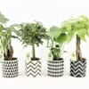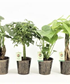 De Alocasia Cucullata wordt gekenmerkt door mooie pijlvormige groene bladeren en een opvallend compacte groei. De Pachira (die ook wel watercacao of geldboom genoemd wordt) is een mooie palm, met een gevlochten stam. De Schefflera die door zijn aparte bladeren Vingersboom genoemd wordt is een erg sterke plant en vraagt nauwelijks aandacht. De Monstera Deliciosa wordt dankzij de speciale vorm van de bladeren ook wel gatenplant genoemd. Deze hippe plant is een bron van inspiratie in de mode- en kunstwereld.