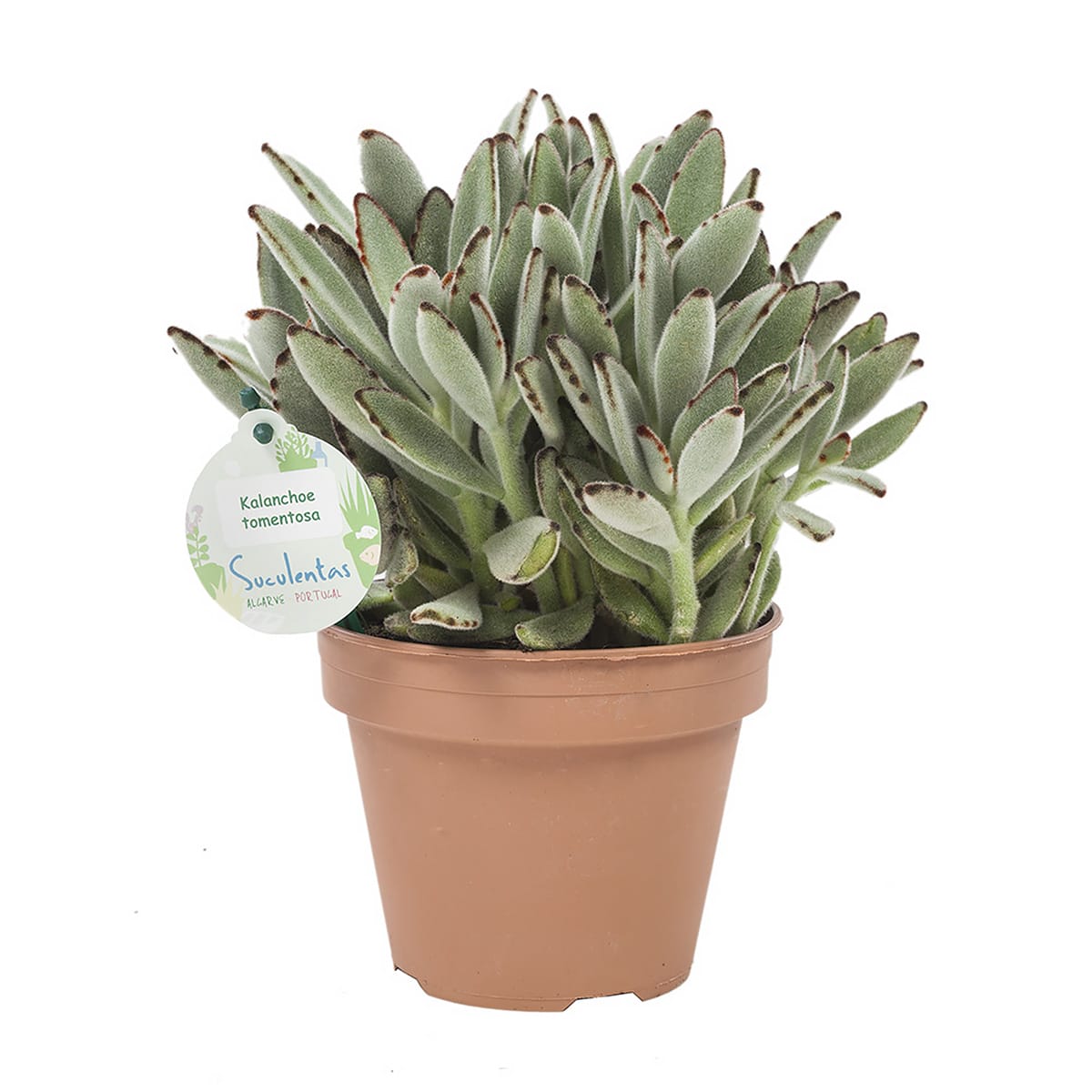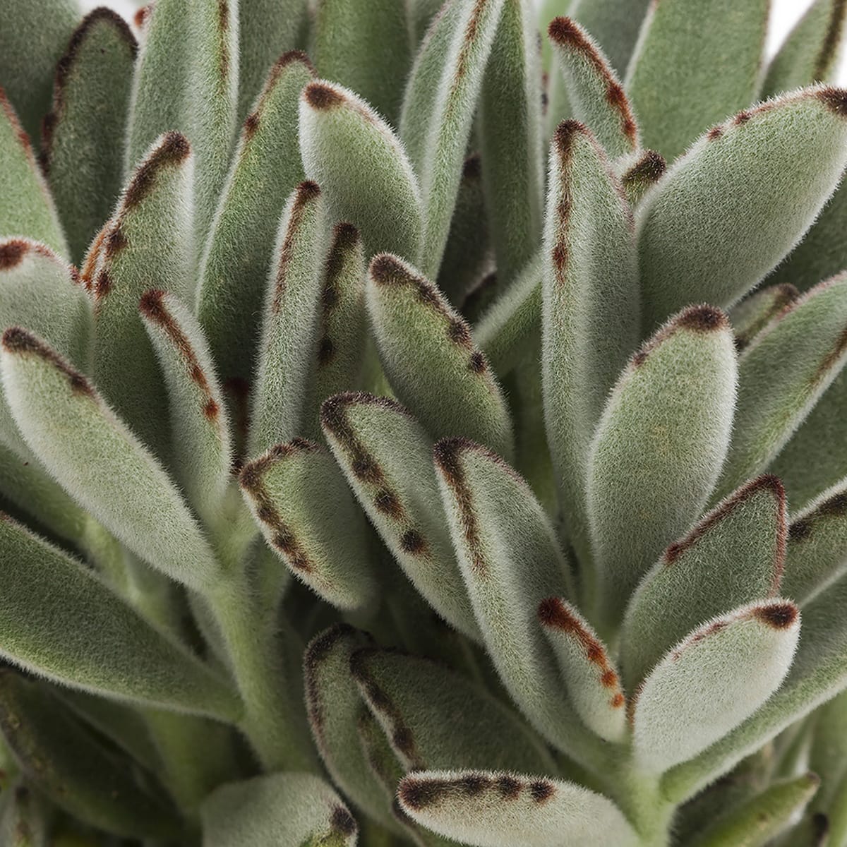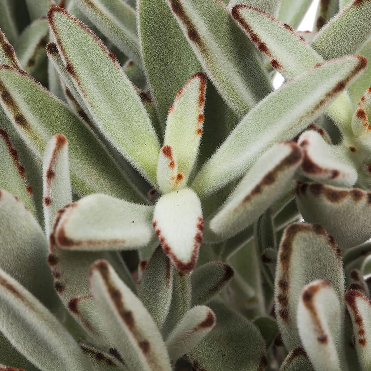 Groengrijze, zilverachtige, wollige behaarde bladeren. Dat maakt deze vetplant apart en zeer herkenbaar. En daar komt de naam ‘Pandaplant’ duidelijk vandaan. De bruine randen op de bladeren horen erbij!