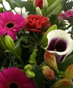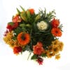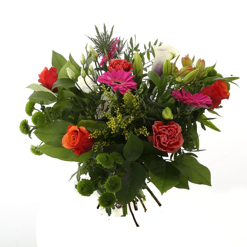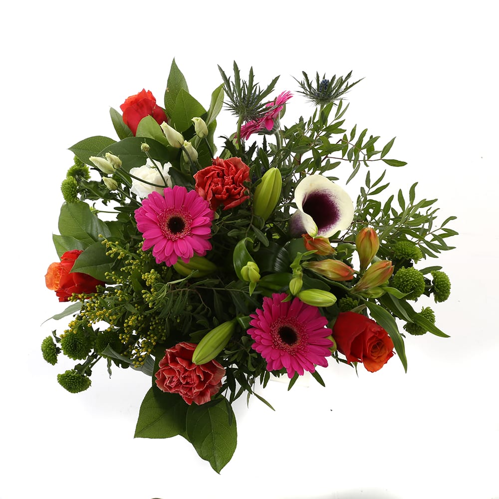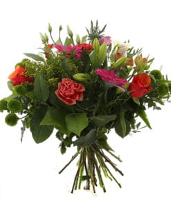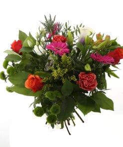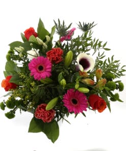 “Een ‘struise struik’ met een mooi formaat voor in de woonkamer. Met de grootste variatie aan bloemen en kleuren: chrysanten, anjers, rozen, distel, alstroemeria, bouvardia en lelie. Dit fleurt en kleurt je hele huis.