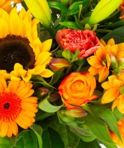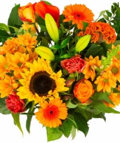 “Een compact geschikt boeket met een royale hoeveelheid verschillende bloemen in oranje tinten.
