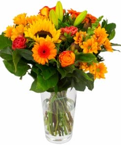 “Een compact geschikt boeket met een royale hoeveelheid verschillende bloemen in oranje tinten.