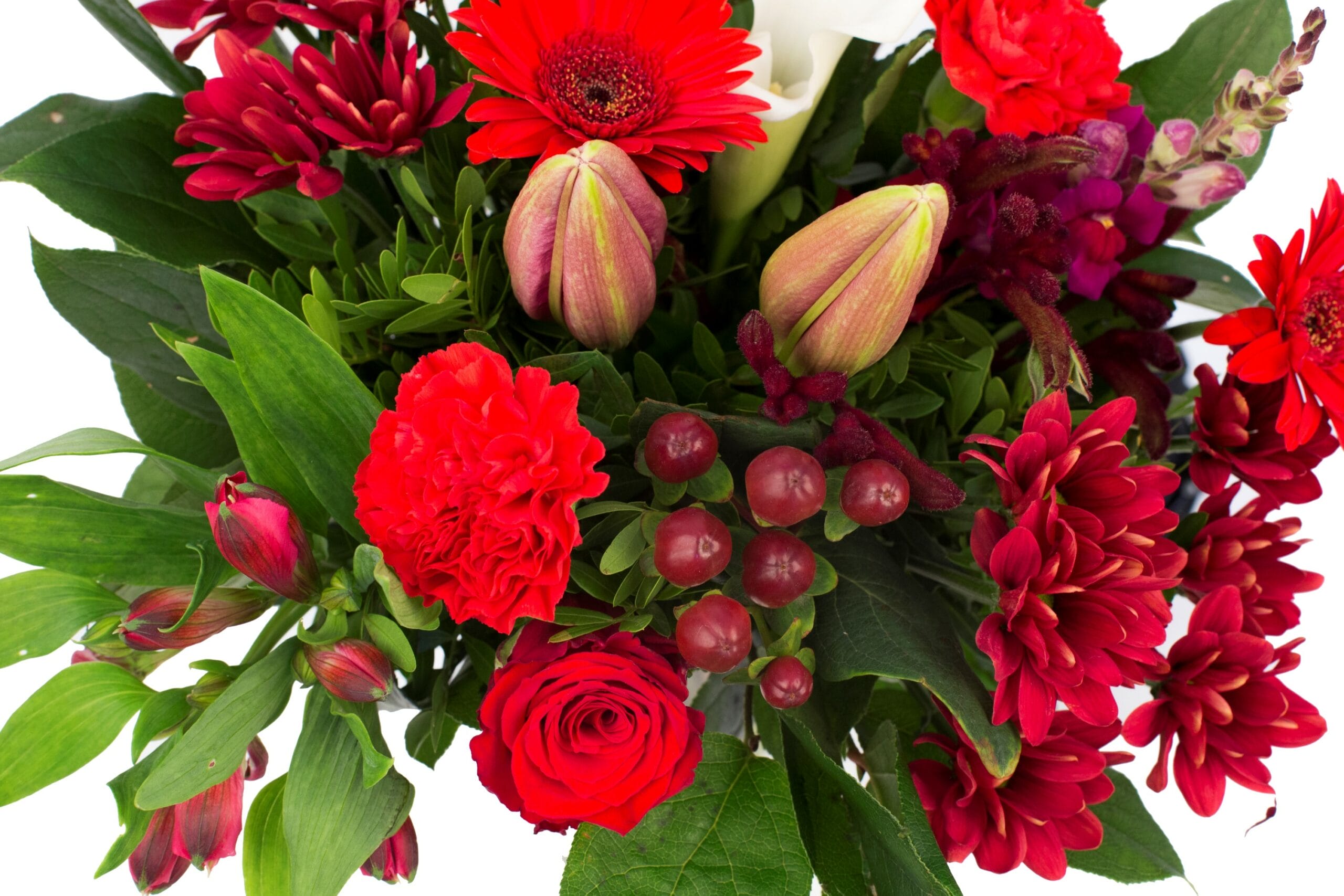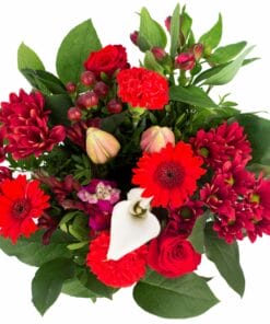 “Een compact geschikt boeket met een royale hoeveelheid verschillende bloemen in vele kleuren rood