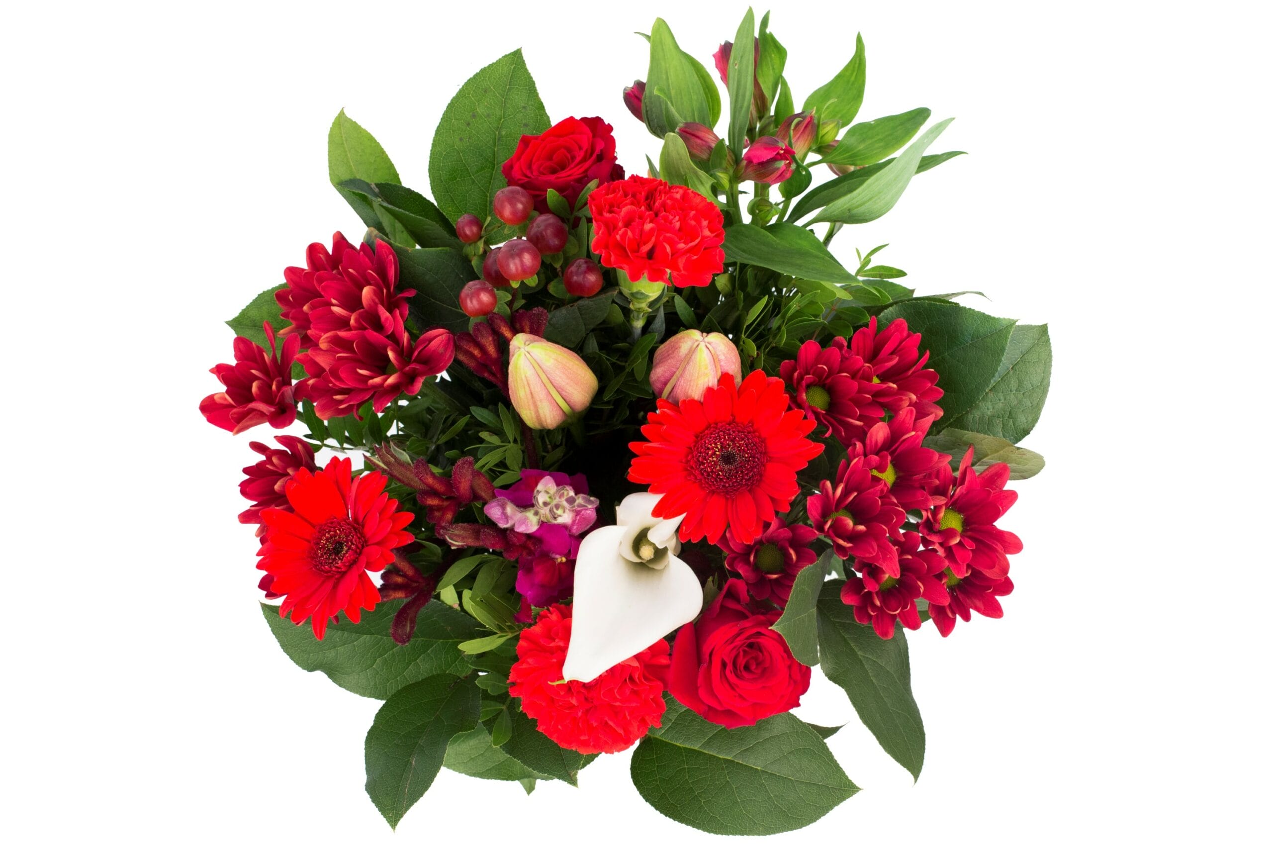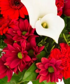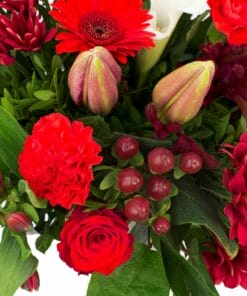 “Rode rozen, gerbera’s, chrysanten en anjers, met leuke witte accenten van sierkool en gips.
