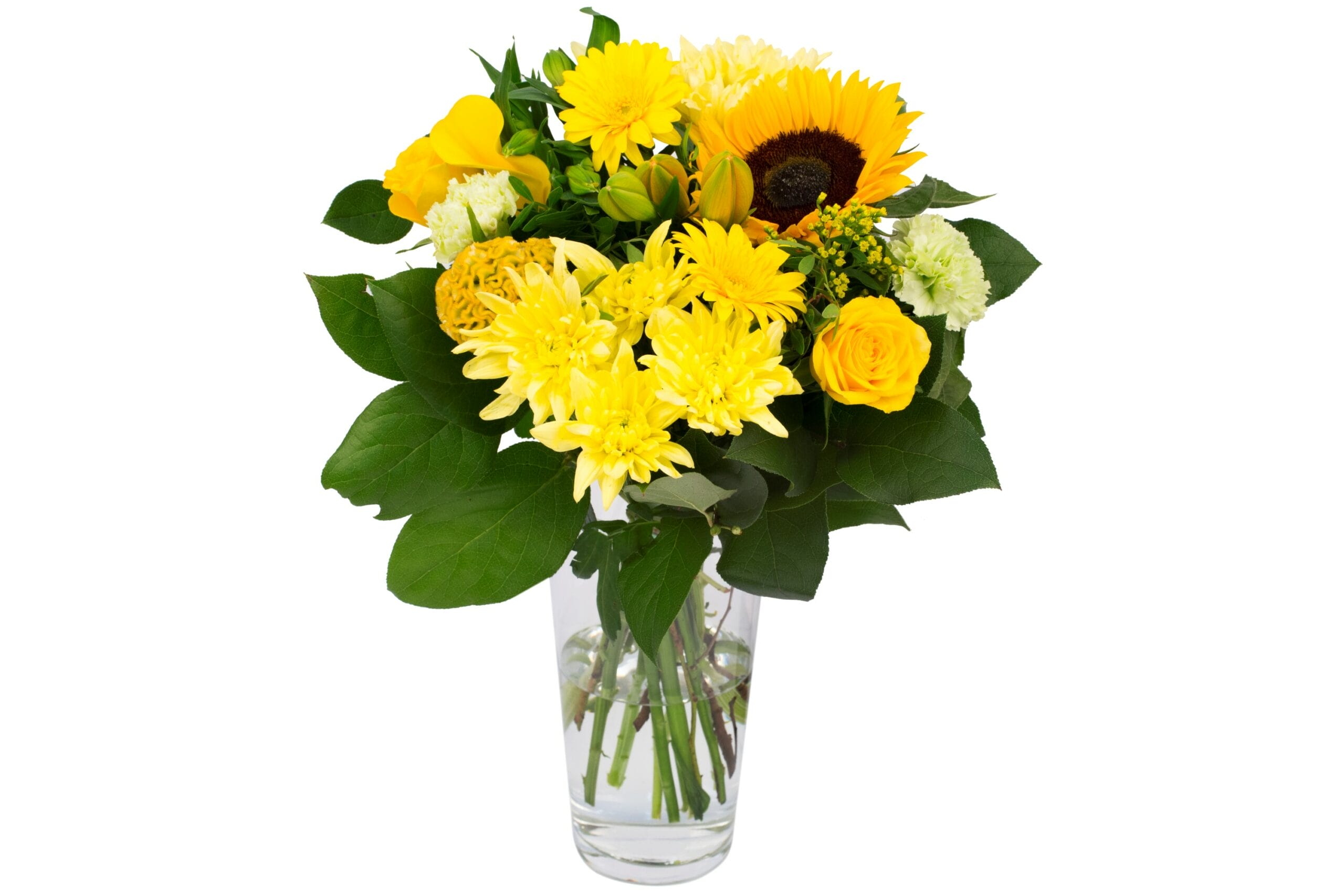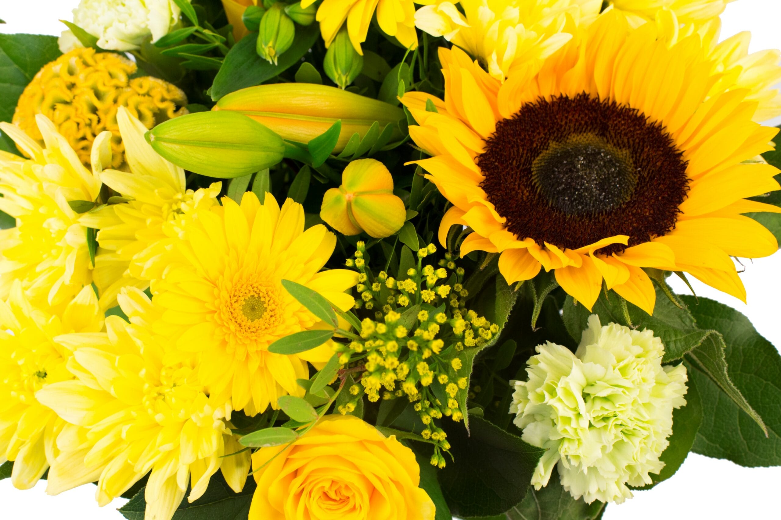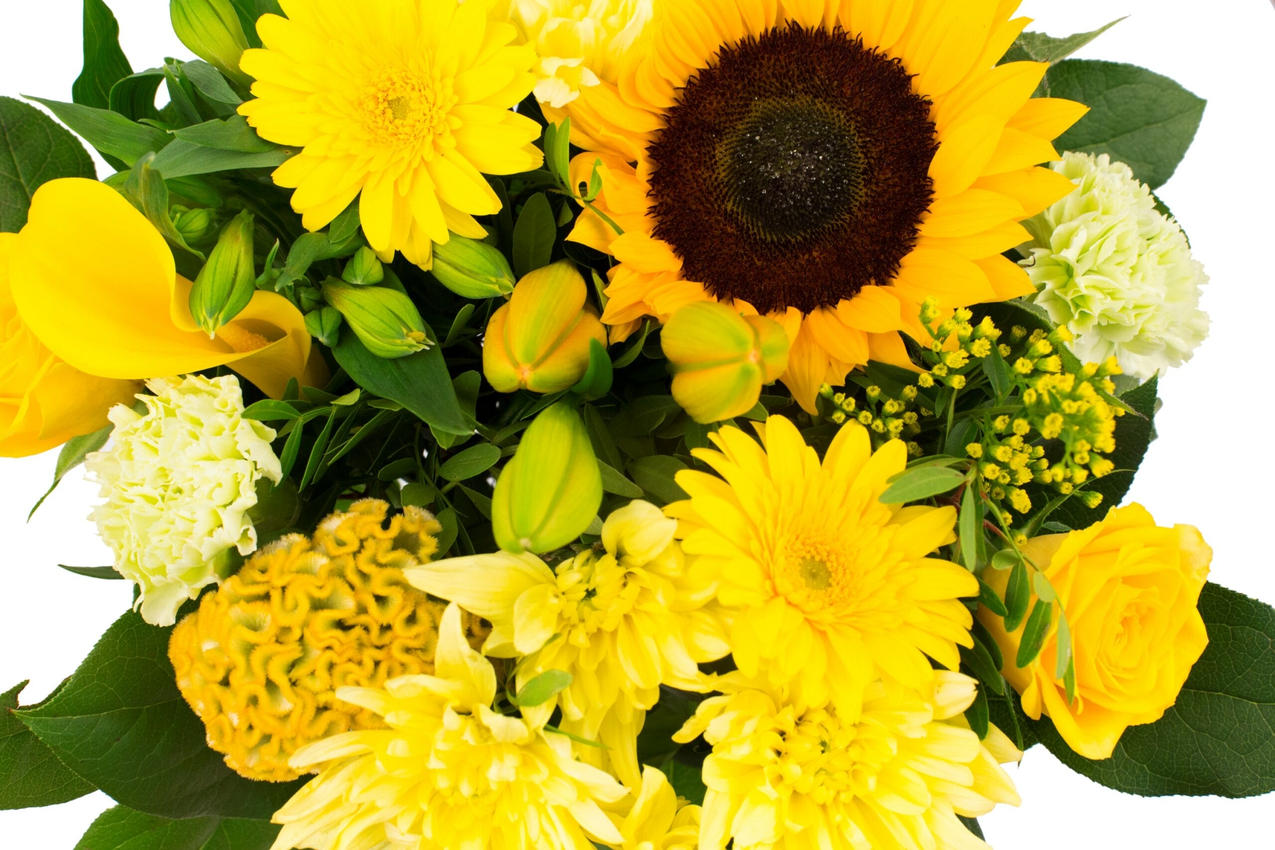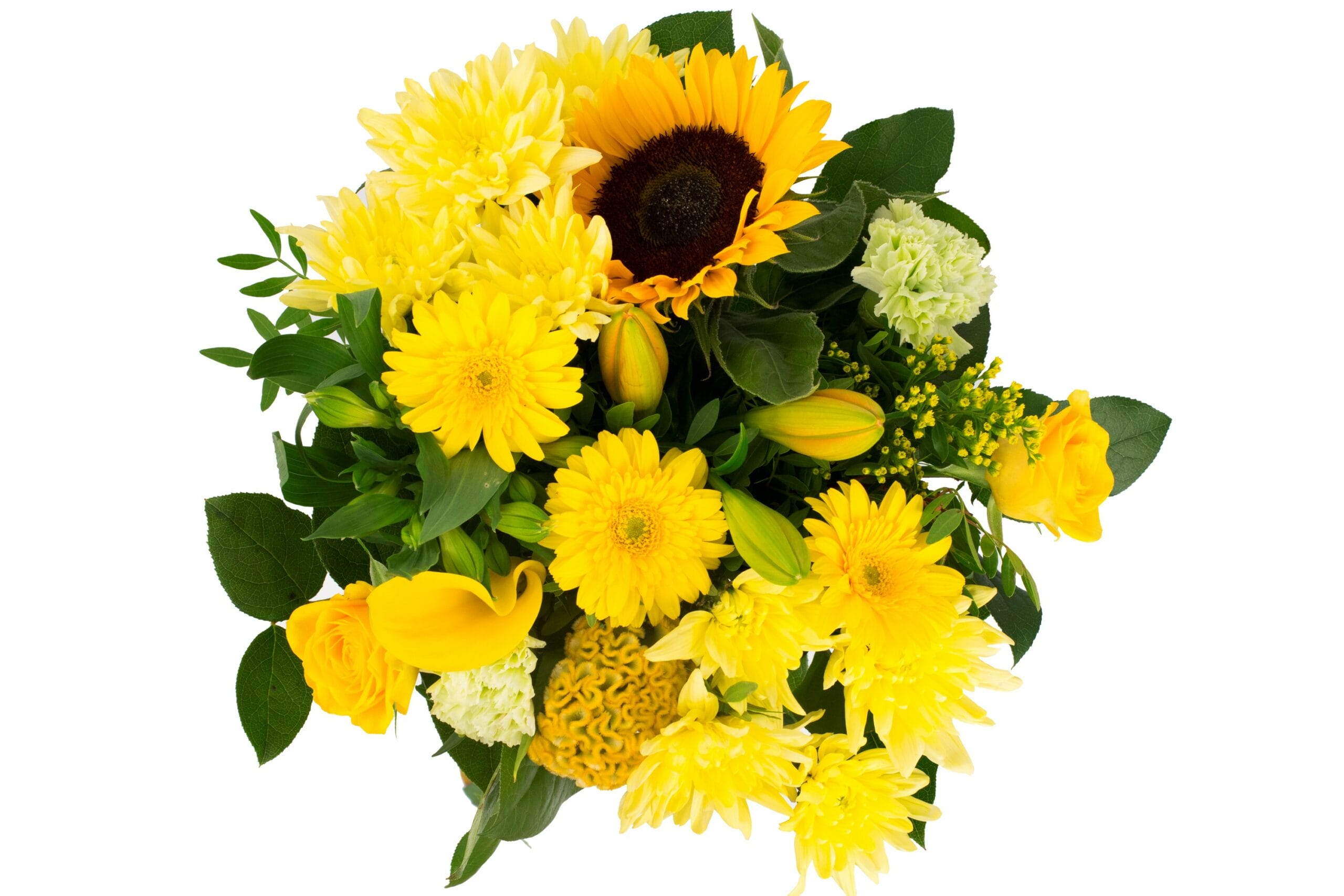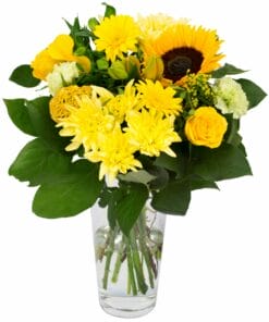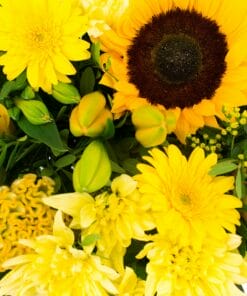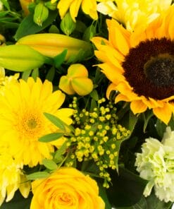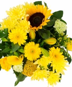 “Een compact geschikt boeket met een royale hoeveelheid verschillende bloemen van licht tot donkergeel