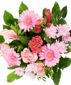 “Een mooi compact boeket met roze bloemen. Roosjes en germini’s zijn de belangrijkste bloemen in dit prachtige boeketje.