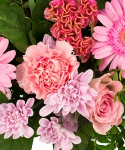 “In dit compacte rose boeket met rozen, gerbera’s, alstroemeria en chrysanten in lieflijk roze, vormt de distel een pittig accent.