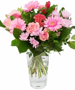 “Een mooi compact boeket met roze bloemen. Roosjes en germini’s zijn de belangrijkste bloemen in dit prachtige boeketje.