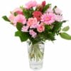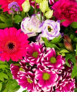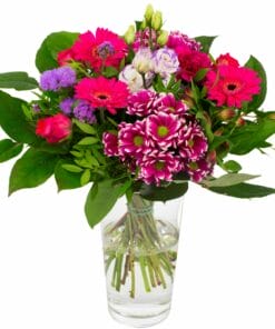 “Een mooi compact boeket met paarse bloemen. Roosjes en germini’s zijn de belangrijkste bloemen in dit prachtige boeketje.