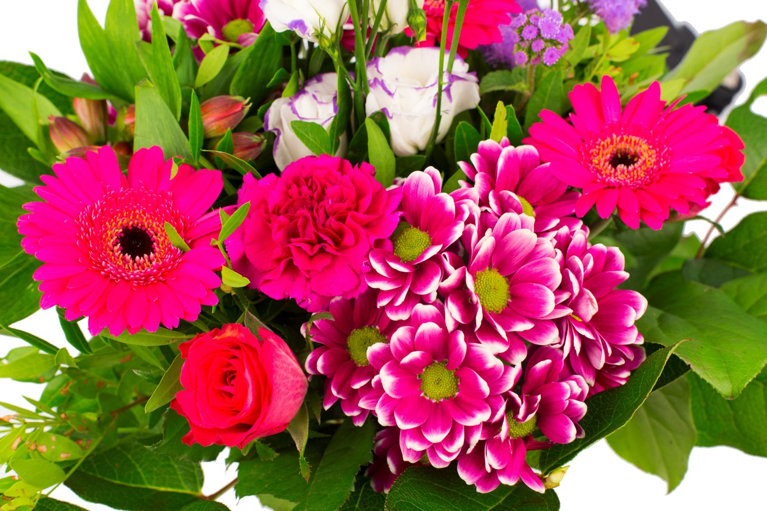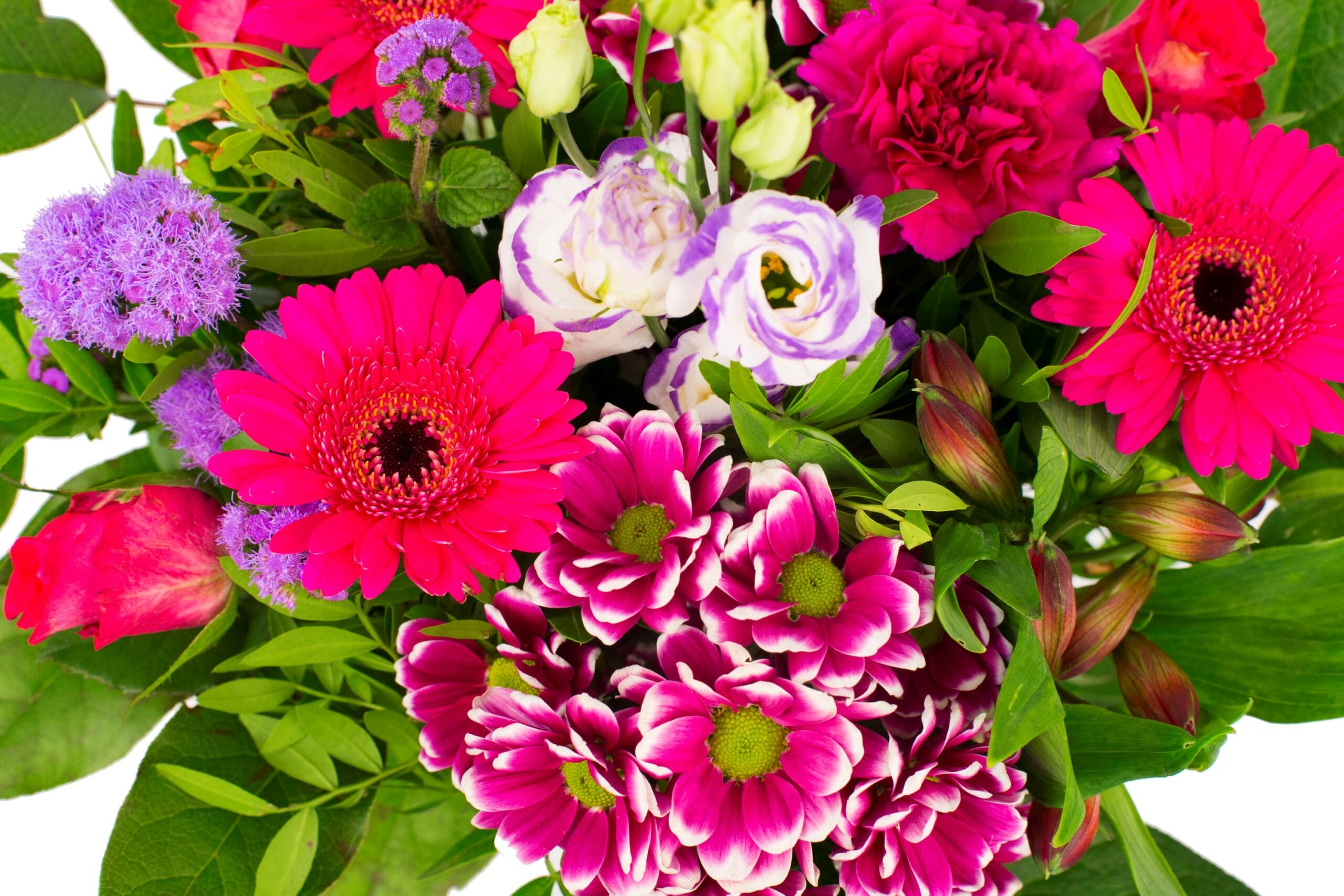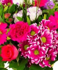 “In dit compacte lila boeket met rozen, gerbera’s, alstroemeria en chrysanten in lieflijk roze, geeft de paarse statice de doorslag.