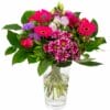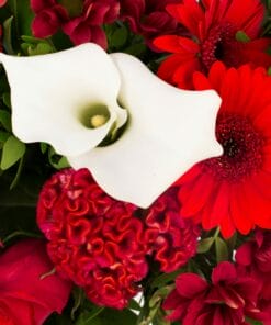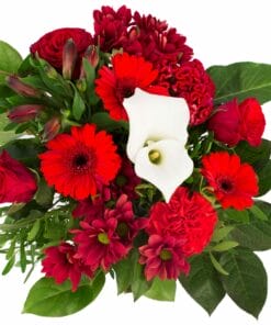 “Een mooi compact boeket met rode bloemen. Roosjes en germini’s zijn de belangrijkste bloemen in dit prachtige boeketje.