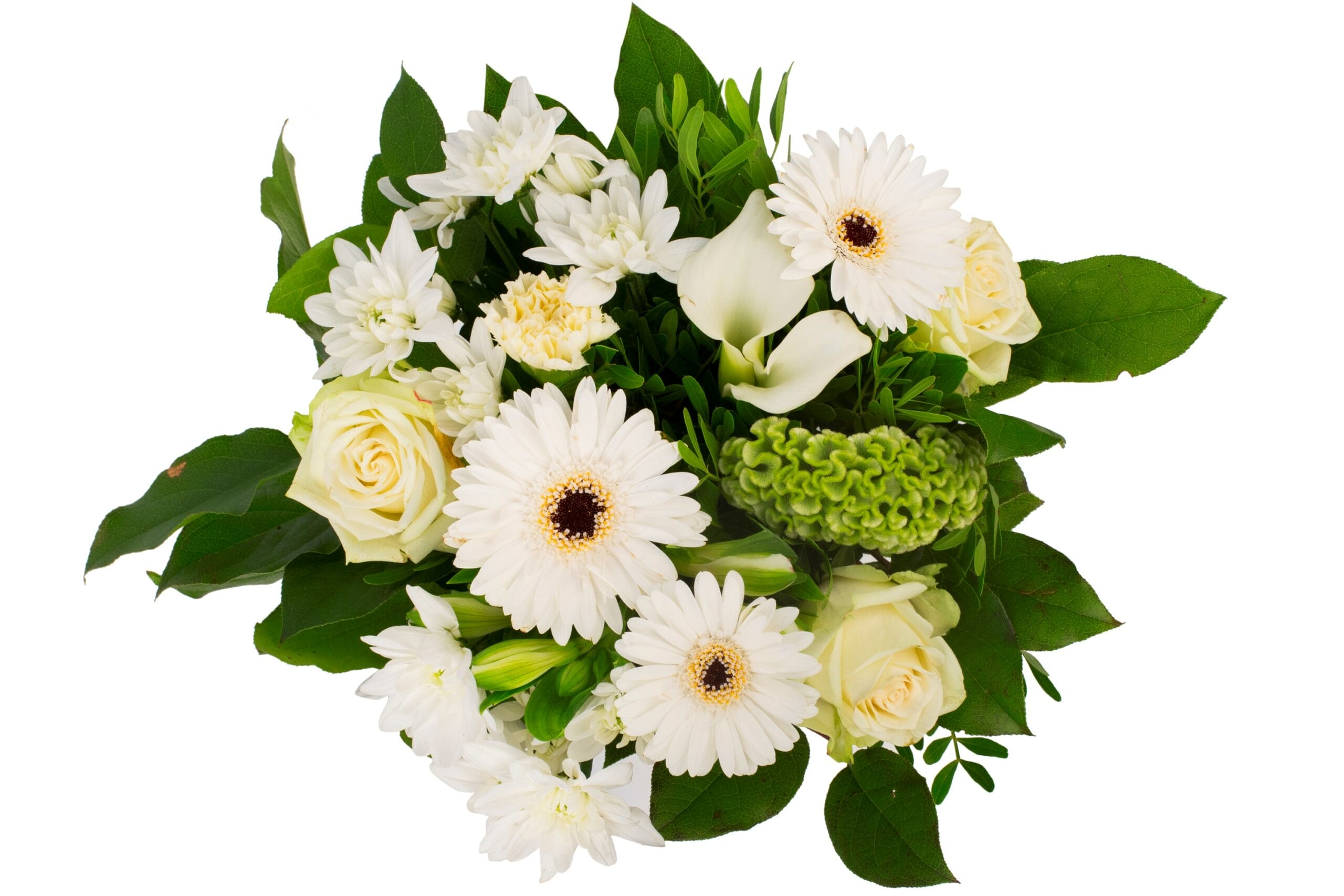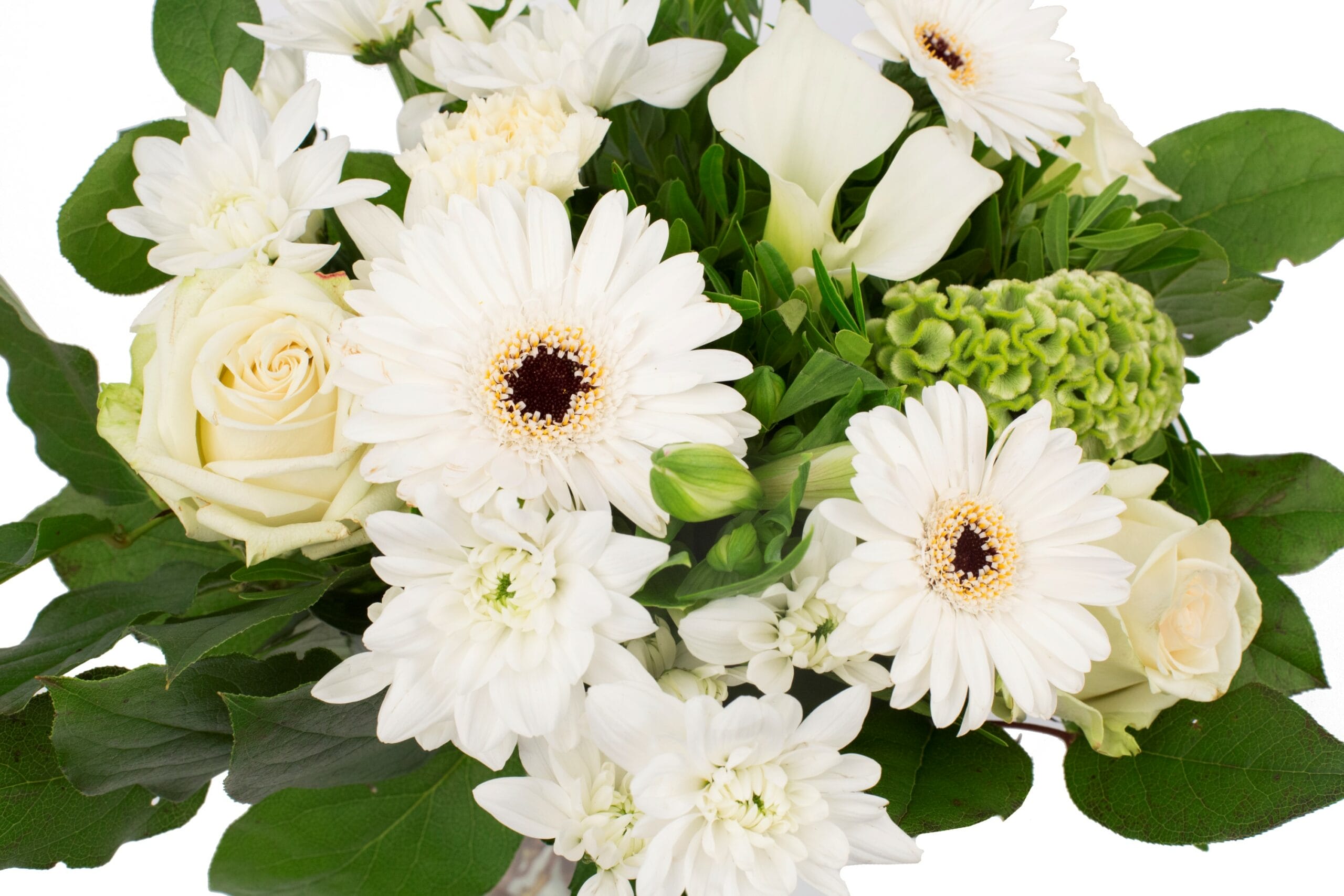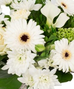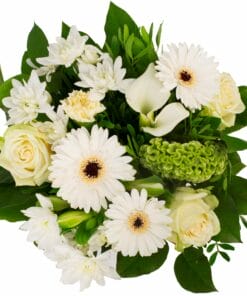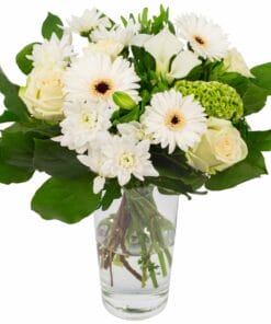 Een mooi compact boeket met witte bloemen. Roosjes en germini’s zijn de belangrijkste bloemen in dit prachtige boeketje.
