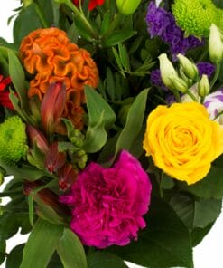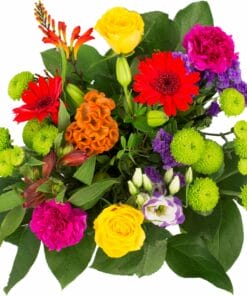 Een mooi compact boeket met een leuke variatie aan kleuren. Roosjes en germini’s zijn de belangrijkste bloemen in dit prachtige boeketje.