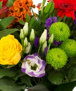 “Een mix van de mooiste bloemen in de mooiste kleuren. Rozen, gerbera’s en chrysanten met opvallende lelies en wat fijnzinnig solidago.