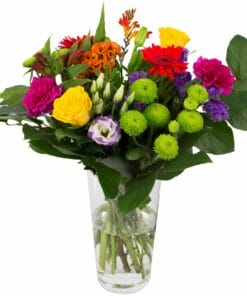 Een mooi compact boeket met een leuke variatie aan kleuren. Roosjes en germini’s zijn de belangrijkste bloemen in dit prachtige boeketje.