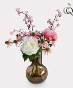 Een aanwinst voor ieder interieur! Dit vrolijke kunstboeket geeft een boost aan werkelijk ieder ruimte. De schitterende roze details geven het boeket een zomerse uitstraling. Het is een geweldige manier om je interieur op te fleuren. Het kunstboeket is van hoge kwaliteit en met zorg samengesteld door een topbloemist. De bloemen blijven lang mooi, waardoor je er voor een lange tijd plezier van hebt. En dat allemaal zonder dat je ze hoeft te onderhouden!
