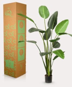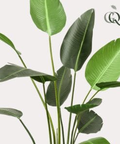 De Strelizia is een prachtige plant die vrij moeilijk in leven te houden is in het Nederlandse klimaat. Daarom kun je waarschijnlijk beter deze kunst Strelizia aanschaffen. Je zult nauwelijks verschil merken want met zijn mooie zijden bladeren geeft hij een ‘net echt’ gevoel. Eigenlijk best een duurzame keuze dus als je erover nadenkt. De Nederlandse naam Paradijsvogelbloem komt van de schitterende bloemen die in de tropen groeien aan de Strelizia. Met paars en oranje lijken ze wel op vogels. In de Nederlandse huiskamers bloeit de Paradijsvogelbloem niet, dus ook onze kunst Strelizia wordt zonder bloemen geleverd. De grote bladeren zijn een genot op zich. Onze Strelizia Nicolai is ook verkrijgbaar in een maat kleiner.