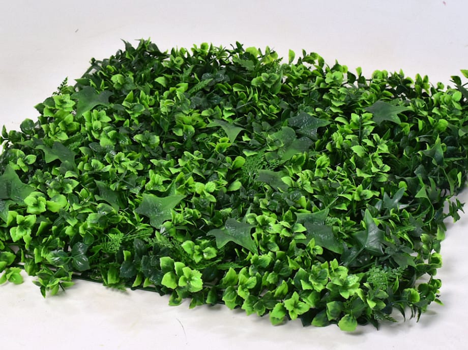 Met dit kunststof paneel maak je zelf een mooie plantenwand binnen in huis of buiten. Je kunt er meerdere naast of onder elkaar bevestigen om zo je eigen verticale tuin binnen in huis of in je tuin te maken. Bijvoorbeeld tegen een muur of onder je overkapping. Daarnaast wordt de verticale plantenwand veel gebruikt in de horeca, winkels en bijvoorbeeld als beurs aankleding. Een plantenwand van kunstplanten heeft geen onderhoud nodig. Het goene wand paneel heeft een afmeting van 50 x 50 cm bestaande uit meerdere kunstplantjes en is geschikt voor binnen en buiten. De bevestiging is afhankelijk van de ondergrond, bijvoorbeeld op een rooster of gaaswerk kunnen ze worden bevestigd met snelbinders. Voor maatwerk kunnen de matten afgeknipt of afgesneden worden om zo ieder oppervlak te kunnen bedekken.