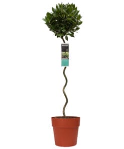 Een exclusieve Laurier met een gedraaide stam. Zes jaar met gekweekt, en met zorg is de stam indeze draaiïng en vorm gesnoeid. De bladeren die u snoeit kunt u vers of gedroogd gebruiken in de keuken. Wist u dat de laurier in de klassieke oudheid een symbool voor de overwinning was? Overwinnaars werden getooid met een lauwerkrans, gemaakt van laurierbladeren. Deze plant is ook een echte overwinnaar, zowel in de keuken als in uw tuin!
