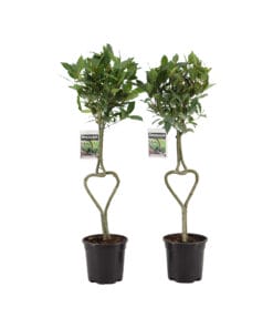 Een duo van 2 identieke bol op stam laurieren waarvan de stam in een hartvorm is gevormd. Een plant voor uzelf en eentje om aan een speciaal iemand te geven? Deze laurieren zijn vijf jaar liefdevol gekweekt en in vorm gesnoeid. De bladeren die u snoeit kunt u vers of gedroogd gebruiken in de keuken. En wist u dat In de Griekse mythologie de altijd groene Laurier staat voor de eeuwig durende liefde van de god Apollo voor de nymf Daphne? Haar vader veranderde Daphne in een laurier om haar te beschermen voor Apollo’s avances, maar Apollo plantte daarop de Laurier rondom zijn tempel om haar te eren en dichtbij te hebben.